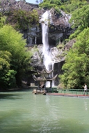沿著石階,一個峰回路轉(zhuǎn)就到了龍吟潭邊,抬頭就會看到瀑布從90米高的懸崖上瀉入龍吟潭。站在壩上,撲面迎來一股涼爽的水汽。龍吟潭底建有水底龍宮,供人游覽,游玩龍宮出來后就坐小木船入洞游覽勝景?戳似俨嫉紫碌5個小洞,船就進(jìn)入冬暖夏涼的龍游洞,一到洞內(nèi)碼頭,就看到洞內(nèi)的巨大洞窟,不看路標(biāo)說不定還會繞暈?zāi)兀瘟怂煻,盤龍瀑就進(jìn)入臥龍?zhí),靠著巖壁入洞中,盤繞上有33米高的圓壁樓梯就是懸空洞,從梯頭拍洞景,往下拍像玫瑰花,向前拍像洞中長廊,洞中倆旁洞室相連,有人防洞,會議廳,餐廳,廁所,廚房和洞宇文化宣傳窗。